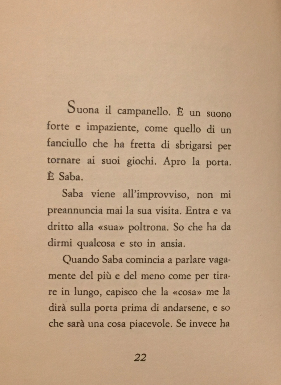 “Suona il campanello. È un suono forte e impaziente, come quello di un fanciullo che ha fretta di sbrigarsi per tornare ai suoi giochi. Apro la porta. È Saba. Saba viene all’improvviso, non mi preannuncia mai la sua visita. Entra e va dritto alla ‘sua’ poltrona. So che ha da dirmi qualcosa e sto in ansia.”